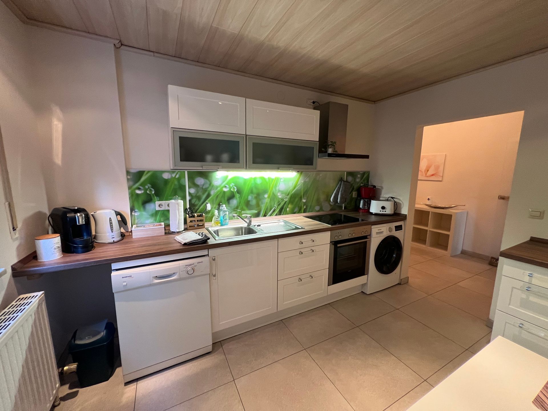 Ausstattung: Spülmaschine, Kühlschrank inkl. Gefrierfach, Waschmaschine, Herd, Mikrowelle, Toaster, Wasserkocher, Kaffeemaschine